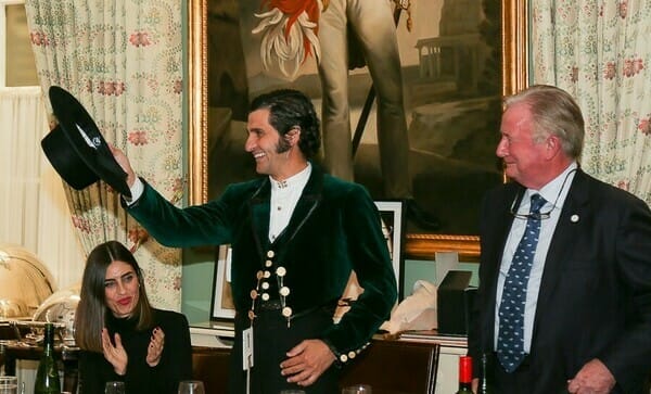 Morante de la Puebla va dejando carteles de toros allá por donde va. También fuera del ruedo. La imagen nos llega desde el Club Taurino de Londres donde recibió un homenaje vestido de un precioso traje corto de chaquetilla de tercipelo verde.